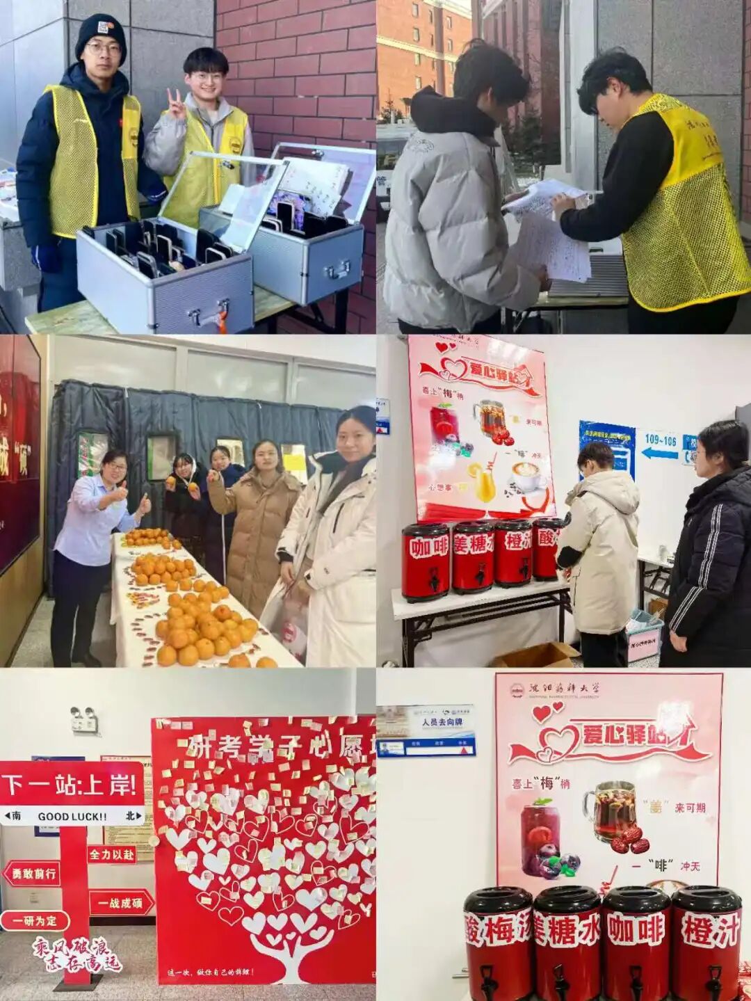 细节之处见真情,人文关怀显温度。在严格管理的同时,我校秉持服务育人理念,推出一系列暖心举措,传递沈药温度。发放考生专用透明文具袋,提醒考生仅携带装有考试证件及考试工具入场,提高安检速度,减少室外低温天气的等候时间;校园内设置清晰指引标识,开辟考生专用通道,志愿者现场引导服务,为考生保管个人物品;考区入口处铺设防滑地垫、地毯,减少因雨雪天气路面湿滑造成的安全隐患;设立现场服务点,提供橙汁、咖啡、姜糖水等热饮,提供应急文具、常用药品、暖贴、口罩等物资;设置研考夜间自习室,为考生提供良好的复习环境;设置心愿墙,传递祝福鼓励考生,关注考生身心状态,及时开展心理疏导,帮助考生从容应考;食堂免费发放爱心餐饮及礼品,为考生提供优先就餐通道;发布考生须知,及时传达和讲解考场规则和考点温馨提示,让考生明确规则、遵守规则,顺利参加考试。